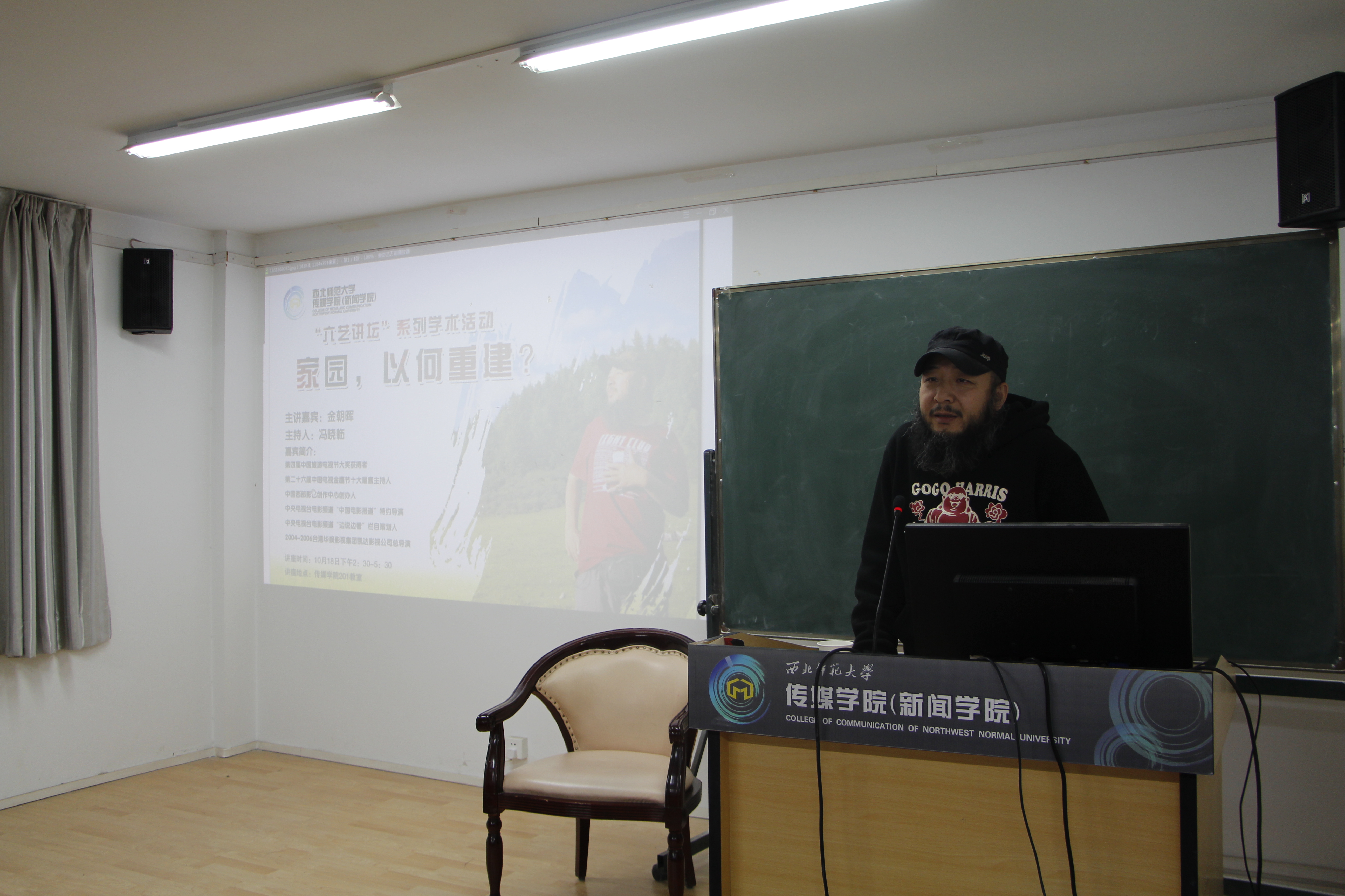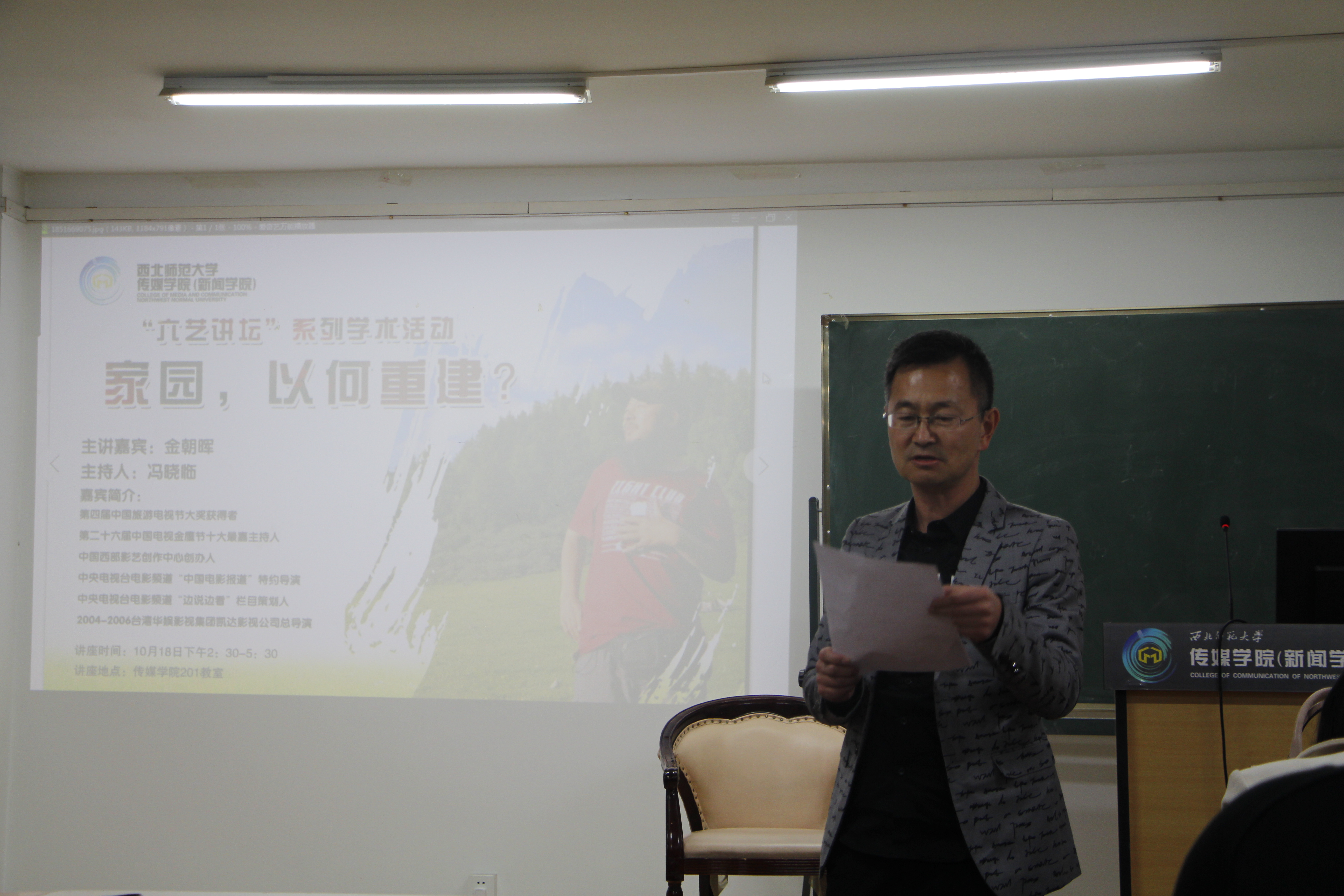 10月18日下午两点半,第四届中国旅游电视节大奖获得者、第26届中国电视金鹰节最佳主持人、中国西部影艺创作中心创办人、中央电视台电影频道“中国电影报道”特约导演金朝晖,在金沙990活动大厅201教室,以“家园,以何重建”为主题进行了学术演讲。讲座由金沙990活动大厅教授冯晓临主持,金沙990活动大厅部分师生听取了此次讲座。此次活动是学院“六艺讲坛”系列活动之一。