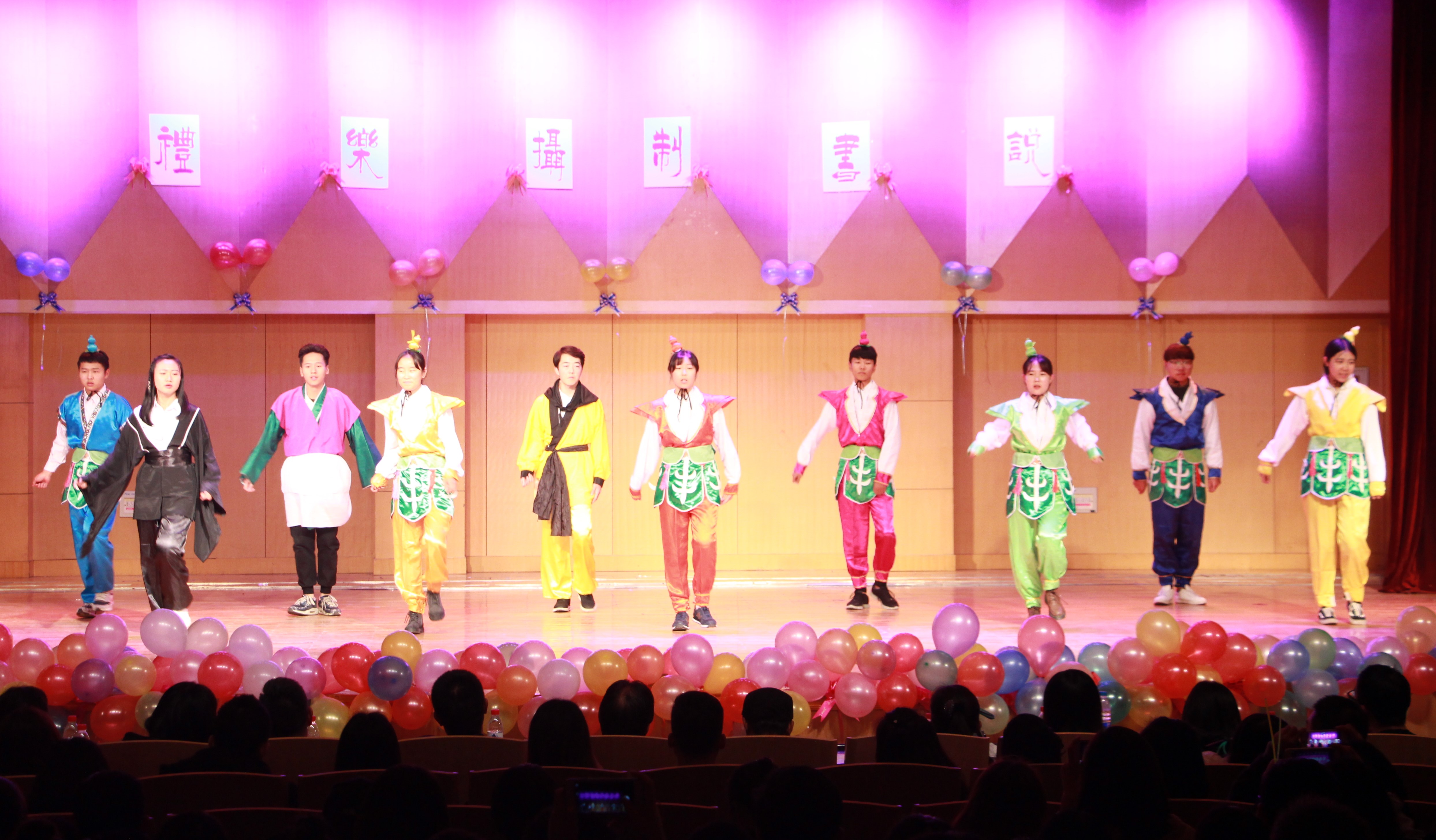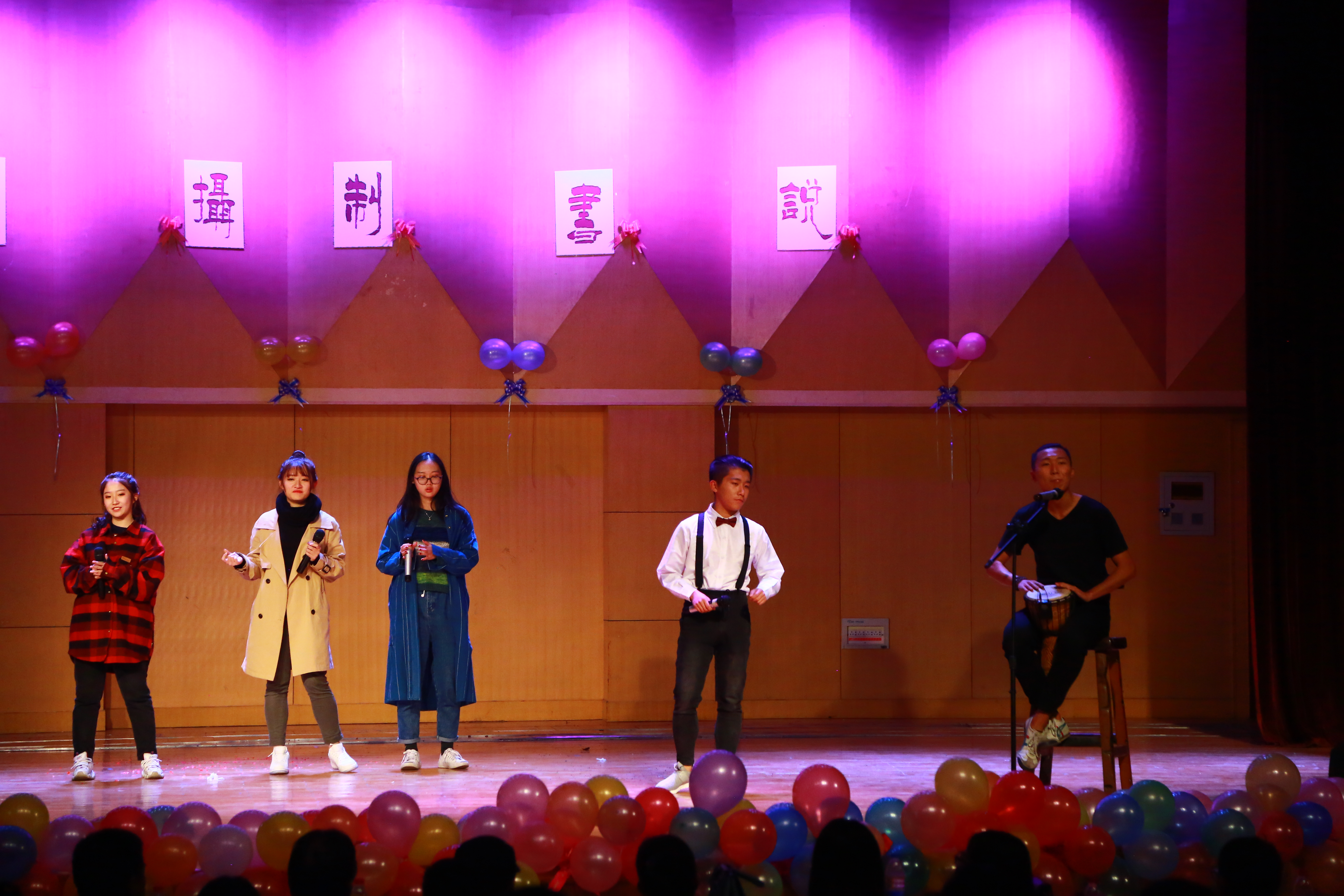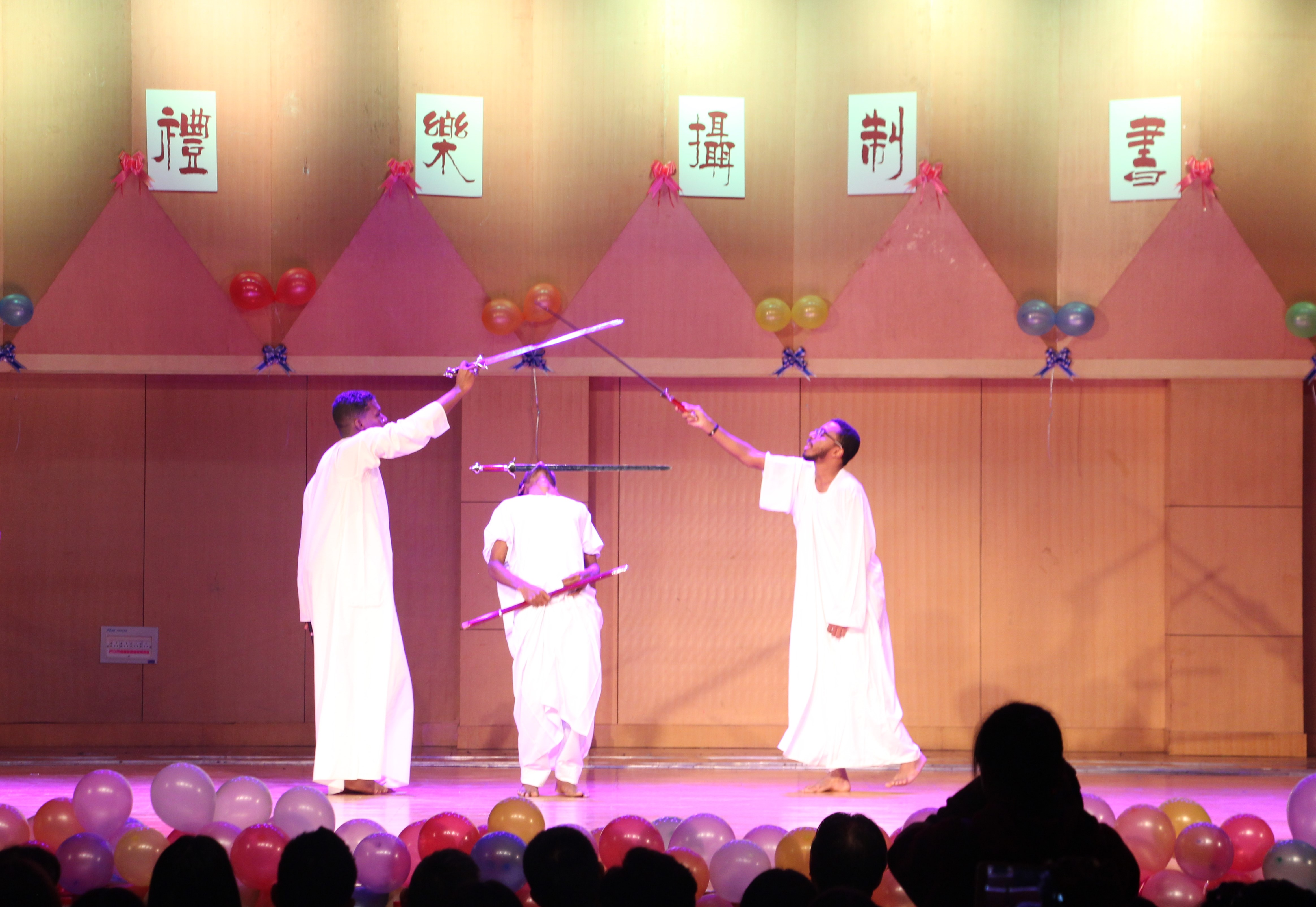 短暂的抽奖环节过后,是17级戏剧与影视学专业苏丹留学生阿布和他的朋友们带来的《苏丹传统舞蹈》,极具异域风情的舞蹈让同学们大饱眼福,大家以热烈的掌声表达对留学生同学们的欢迎。随后,17级播音与主持艺术一班的“戏精”们带来小品《被冤枉的记忆》,“戏精”们卖力的表演使观众们捧腹大笑,让我们不禁想问:十三年前的你们也这么可爱吗?体育学院带来的武术表演《武魂》高潮不断,他们手握利剑,挥洒自如,跺脚声在舞台上回荡不断,赢得全场掌声和欢呼。17级动画一班的同学们带来的舞蹈《Good time》,以“葫芦娃”的装扮登场,新意十足。