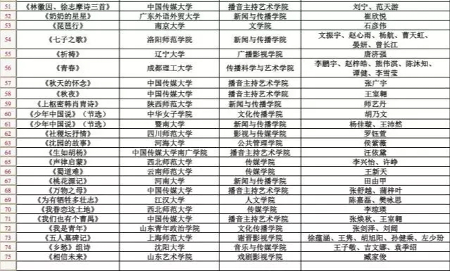 我院15级播音与主持艺术一班李琼英的《我眷恋这土地》和16级播音与主持艺术一班李兴怡、16级播音与主持艺术一班许峥合作的《声律启蒙》进入复赛。据悉,此次我院报送了42个节目,共有2个节目通过复试。