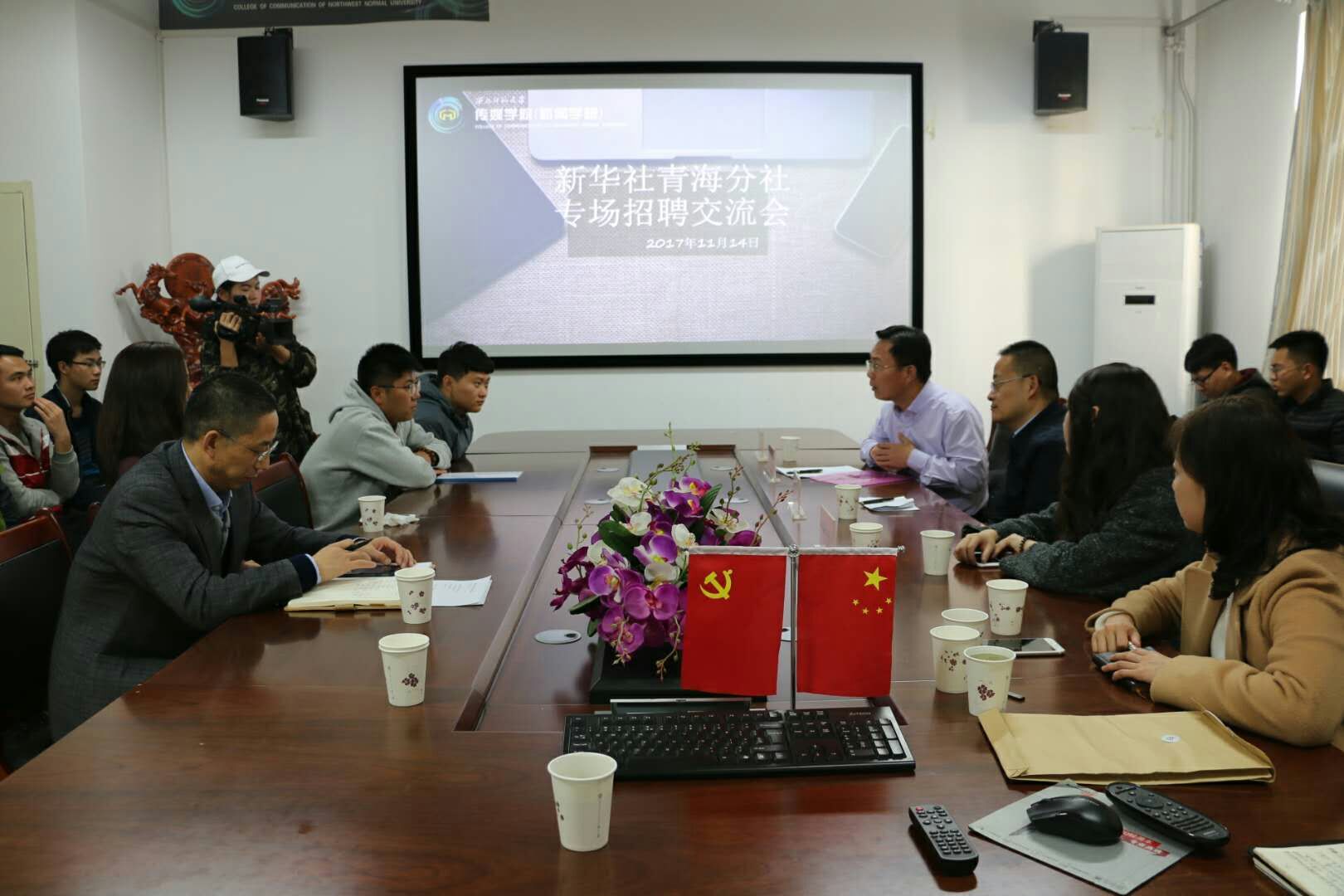 11月14日下午,金沙990活动大厅于学院310会议室举办了新华社青海分社专场招聘交流活动。新华社青海分社副社长毛磊,办公室主任候德强及王金金、候晋参加。参加本次交流会的有我院党委副书记、副院长王德祥,新闻系副主任庄金玉,我院新闻系应届本科毕业生与研究生以及计算机科学与工程学院的应届毕业生。