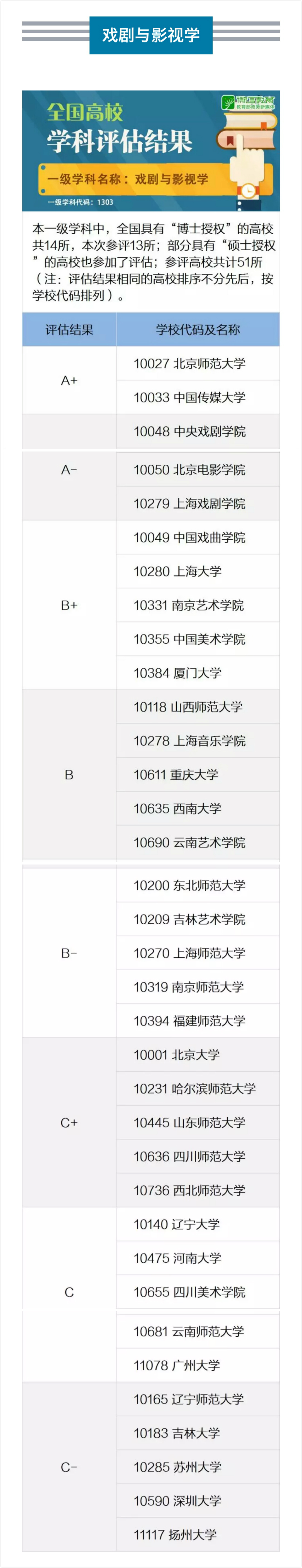 我校参评的28个学科中,教育学为B+,中国语言文学、数学为B,马克思主义理论、外国语言文学、物理学、化学、地理学、美术学等6个学科为B-,心理学、体育学、中国史、音乐与舞蹈学、戏剧与影视学等5个学科为C+,其他学科没有进入前70%。我院戏剧与影视学排名西北第一,西部第四。