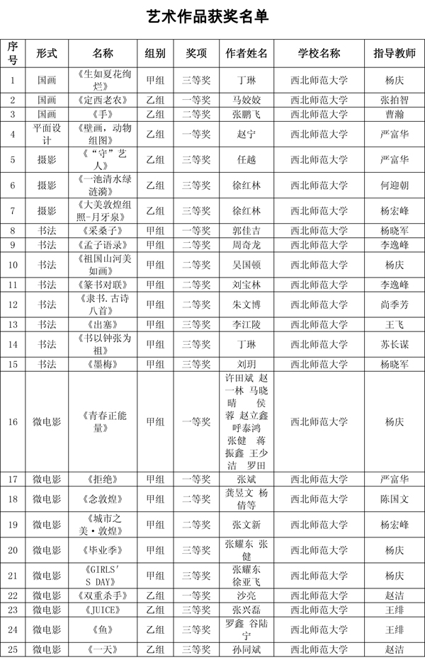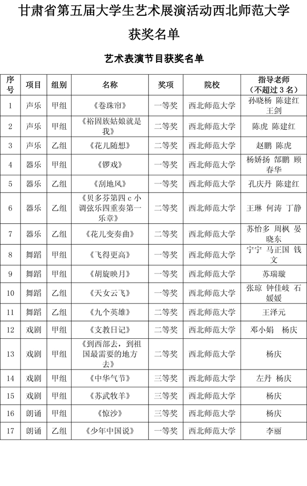 展演活动以“理想与信念”为主题,由甘肃省教育厅主办。我校在活动中获得66项奖励,充分展示了学校艺术教育的丰硕成果,获奖等次和获奖数量为历届最高。