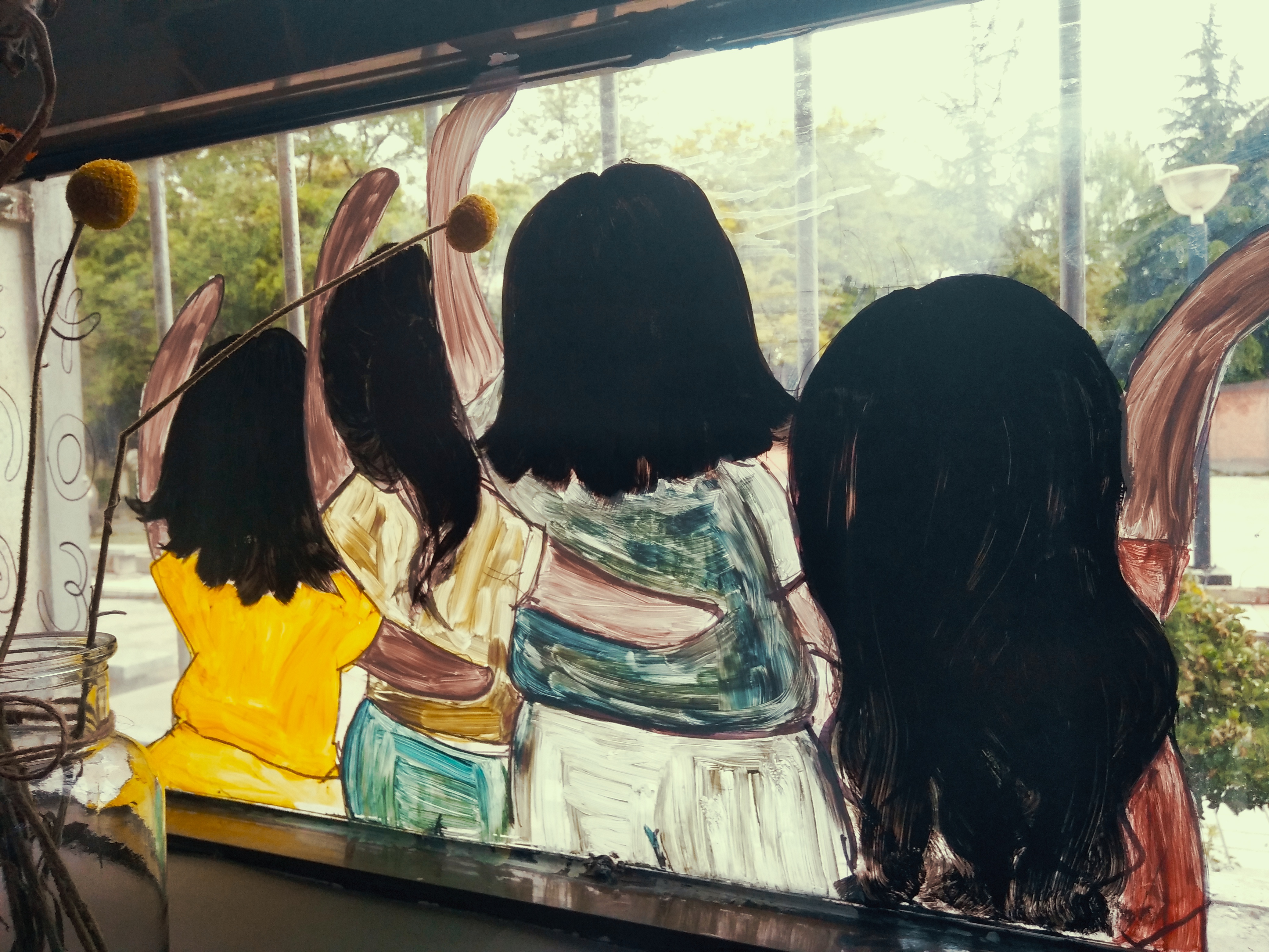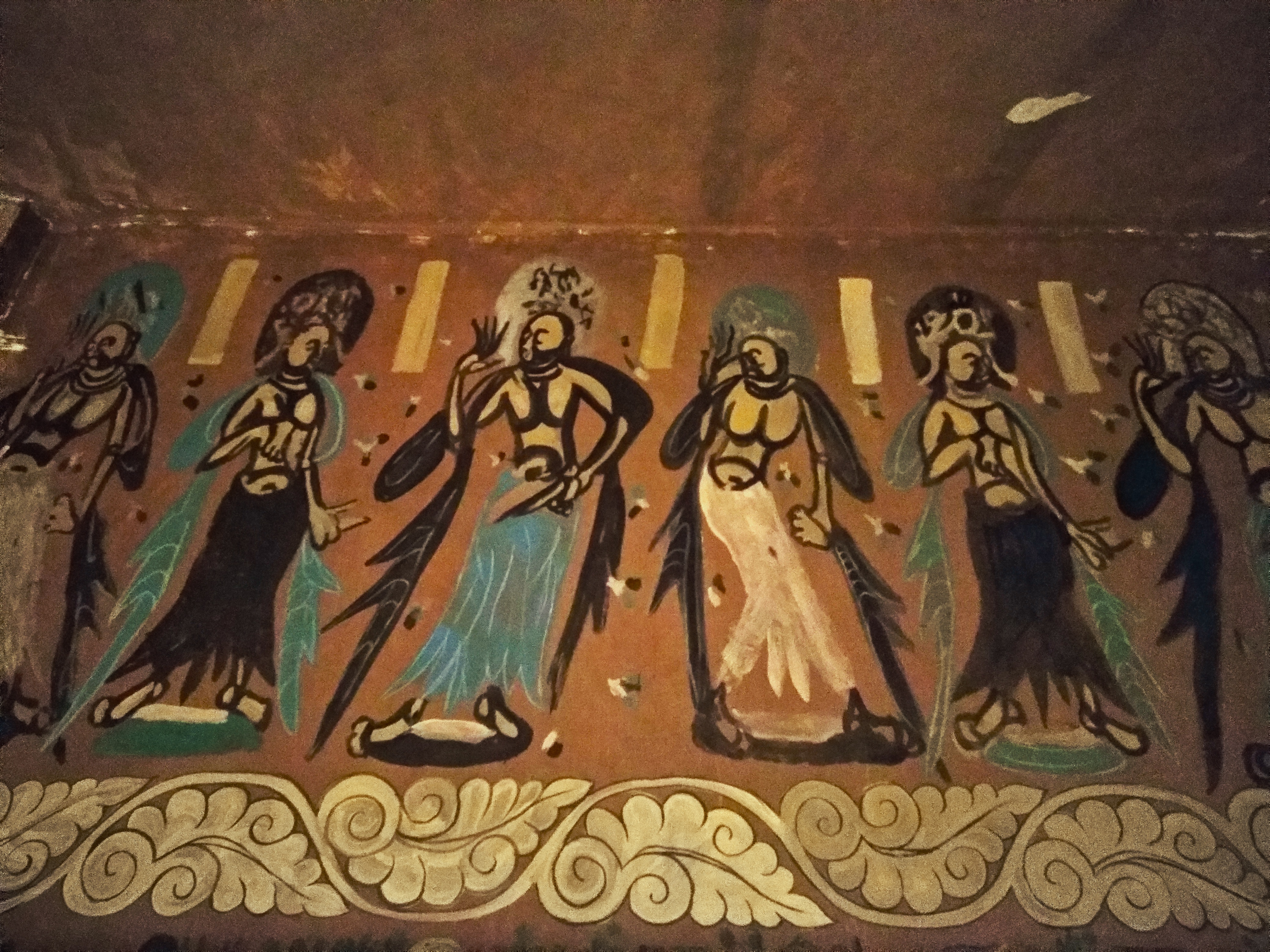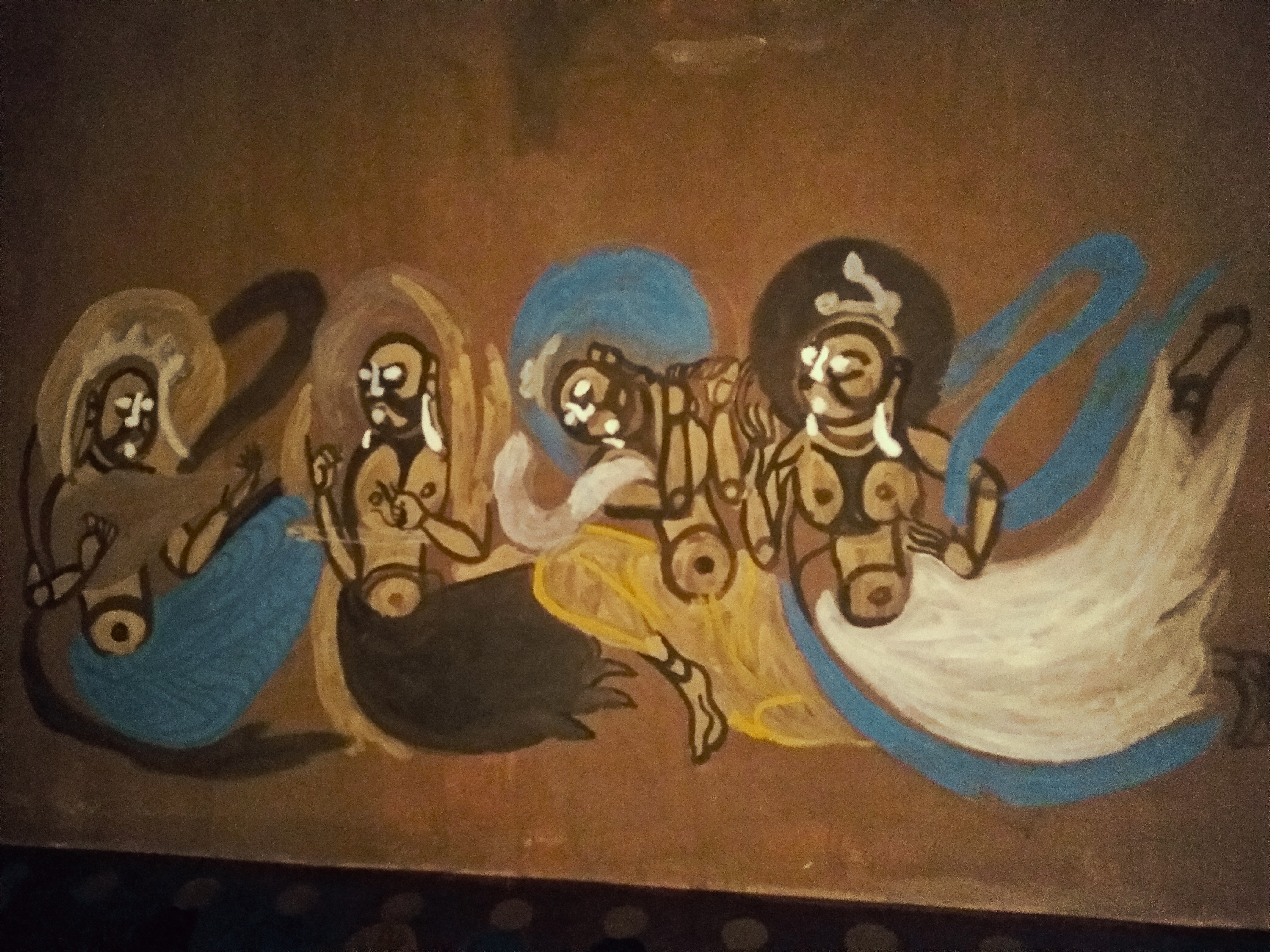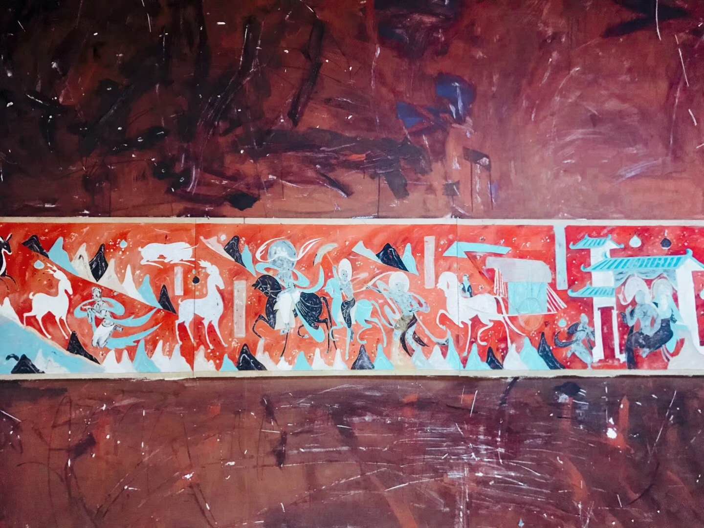 《睒子本生》是此次毕业作品展览中最特别的一部作品,他们采用洞窟形制展览,将洞窟搬进师大,以莫高窟299号洞窟中的一铺本生故事画作为他们创作的题材,通过这种方式来弘扬孝道和敦煌文化。洞窟中所有壁画都由小组成员亲自手绘。