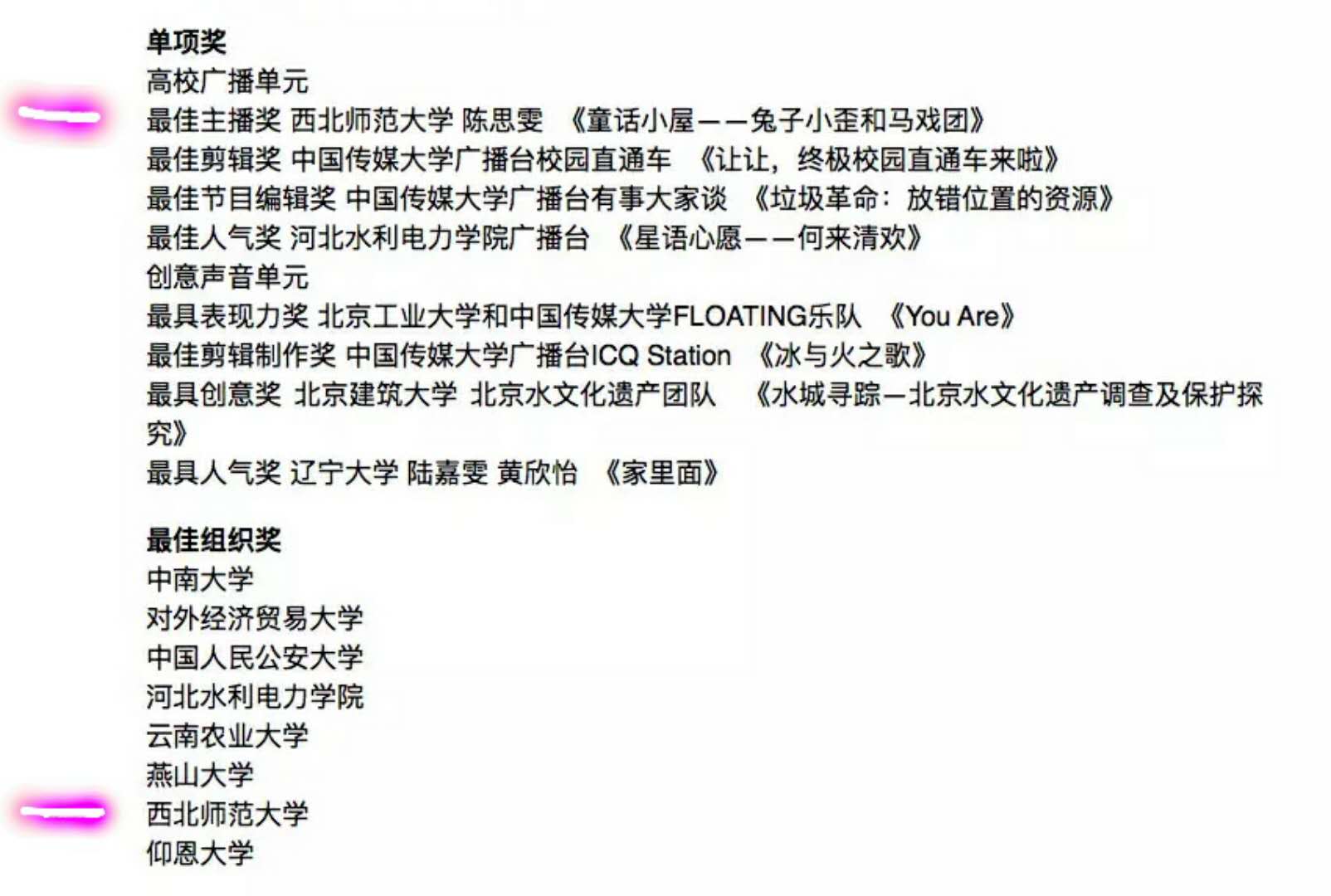 近日,第十一届北京大学生声音潮流季闭幕盛典暨颁奖晚会在中国传媒大学举行,北京新闻广播节目部主任、《新闻2018》节目制作人杨洪、北京交通广播《一路畅通》节目主持人郭炜、著名配音演员、朗诵解说艺术家周扬等出席晚会。在本次比赛活动中,金沙990活动大厅2016级播音与主持艺术班陈思雯同学的作品《童话小屋---兔子小歪和马戏团》获得高校广播单元“最佳主播奖”,金沙990活动大厅荣获“最佳组织奖”。参加本次晚会的2016播音与主持艺术班李煜同学说:“本次活动给我们带来了全新的感受,我们要从其他高校优秀的广播站那里不断学习,不断创新”。