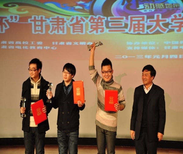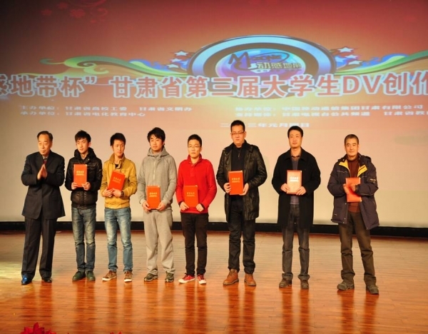 1月4日下午,由甘肃省高校工委、甘肃省文明办联合主办,甘肃省电化教育中心承办,中国移动通信集团甘肃有限公司和兰州大学协办的“动感地带杯”甘肃省第三届大学生DV创作大赛颁奖典礼在兰州万商国际飞天影城隆重举行。金沙990活动大厅靳刚等九位学生创作的8部作品获奖,其中2008级广播电视编导专业学生张跃龄的《坏爸爸》、王子元的《大良的菜刀》和2009级播音与主持艺术专业学生靳刚的《时间游戏》等三部作品包揽大赛一等奖;刘涛、任志明、孟子为、张浩、张立潮等五位老师被评为“优秀指导教师”。同时,我校被组委会授予“优秀组织奖”。