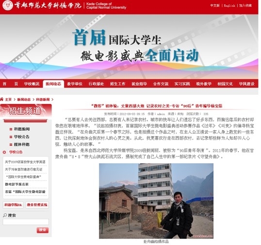 9月3日,我院新闻系2009级学生杨宝磊接受了“首届国际大学生微电影盛典”组委会的电话专访,这也是西北地区唯一受访的学生导演。这源于他选送的两部片子《过年》和《刈麦》受到组委会及评委的认可。这两部片子是由我院教师孟子为、陈积银指导学生经过两年的时间,在甘肃舟曲、通渭等地摄制的纪录片。