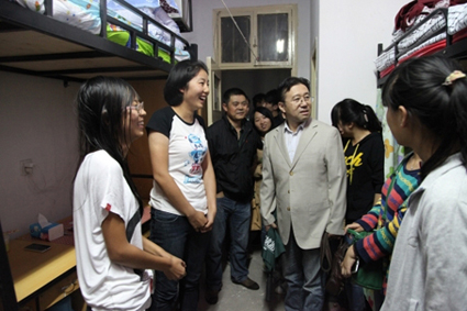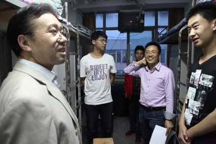 9月4日,我院2013年迎新工作顺利结束后,晚上7点半学院党委书记符得团,副院长徐兆寿,党委副书记、副院长王德祥,副院长杨华、刘涛,学生辅导员及2013级各班班主任、部分研究生导师在团委、学生会干部的陪同下分别到兰天公寓及新校区新生宿舍,看望我院2013级新生,深入了解新生入住情况。