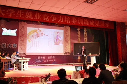 以“师苑情,从师梦”为主题的2013年“职‘为’你开”大学生从师技能大赛自5月初启动以来,共有18 个学院赛区和一个网络赛区的1069名学生参与到比赛中,活动覆盖到全体师范生和部分非师范生。比赛期间,参赛选手参加了以板书与规范汉字书写、普通话与教师口语表达、多媒体课件制作、信息化教学、课堂教学设计、班级活动组织与管理以及心理素质、仪态仪表、才艺特长、暑期支教实践为主要内容的就业竞争力提升训练营的集中训练。