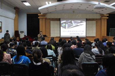 2014年春季学期,现大四新闻班全体同学分散到全国各地各级媒体开始了为期一学期的实习生涯。在报告会上,在新华社驻甘记者站实习的张大川、在《工人日报》驻甘记者站实习的李丽、在《中国青年报》驻甘记者站实习的孙谦、在内蒙古电视台《法制先行》栏目组实习的王维丽丝和在《香港商报》驻甘记者站实习的濮晓都通过幻灯片和照片展示,讲述了他们在新闻实践中的亲身经历和切身体会。在他们的实习过程中,有到处奔波去采访被拒的无措,也有多次改稿最终不了了之的无奈,还有写稿成功发表的喜悦。他们用不同的实习经历却相似的实习心得劝告学弟学妹:要找到好的实习平台以此去获得更多的知识体验;不断提升新闻敏锐度、积极培养新闻思维;多看书多看报提高写作能力、写作摄影全方位锻炼,积极促进个人技能的完善。