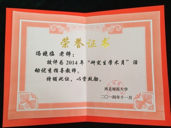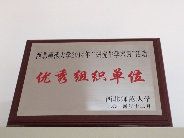 2014年研究生学术活动月相关活动在我院研究生团体的精心组织和广大师生的积极参与下圆满结束。在12月4号研究生院举办的“研究生学术月”颁奖典礼上,我院荣获“优秀组织奖”,冯晓临老师被评为“优秀指导老师”,张璧瑕同学被评为本年度“学术之星”。希望我院老师及同学再接再厉,再创佳绩。
