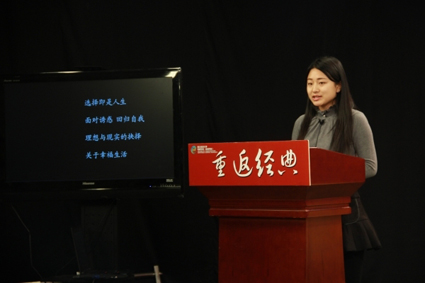 秦楠同学分享了一部讲述在重庆涪陵生活的外国人的故事的小说——《江城》的阅读体验,王昊源同学以第一主人公自述展开对《海上钢琴师》的感受,从“选择即是人生”、“面对诱惑、回归自我”、“理想与现实的抉择”、“关于幸福生活”四个方面去反思自我生存状态:怎样过自己想要的生活,想清楚并为之坚守下去。许璐同学带来的是时下热映电影《匆匆那年》的演讲,不同的青春,难以复制的故事情节却引起无数人的共鸣,究其原因,不过是“青春本就大众,其实你的我的,本就不差毫厘。”最后,她以“感性深爱,理性放手”结束这场关于青春的演讲。高亚楠同学对近期内大热的网络热帖的改编现象进行了深入讨论,从改变热炒的崛起和变迁开始,分析观众对于小说这种介于真实与虚构之间的文学接受心理以及热帖下的新的文学写作形态,“网络热帖不再符合现实,真实是根本,虚构更能迎合大众。”