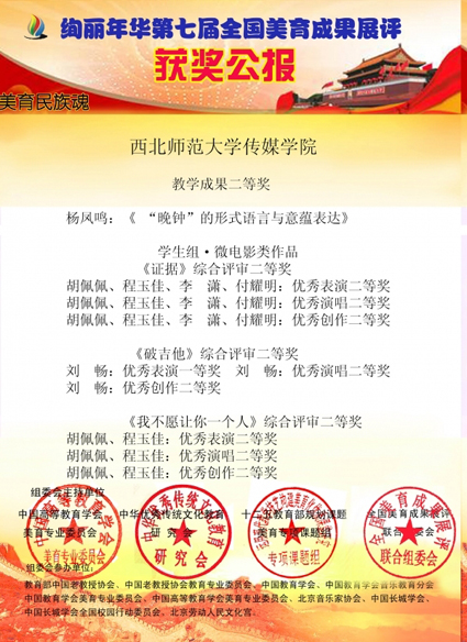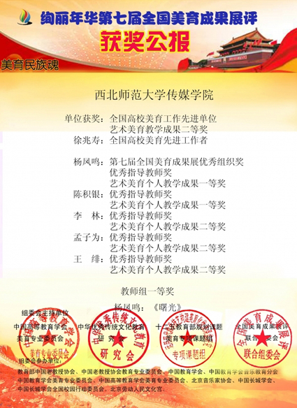 教师组。徐兆寿院长获得“全国高校美育先进工作者”称号,杨凤鸣老师、陈积银老师、李林老师、孟子为老师、王绯老师获得“优秀指导教师奖”,杨凤鸣老师和陈积银老师获得“艺术美育个人教学成果一等奖”、李林老师、孟子为老师、王绯老师获得“艺术美育个人教学成果二等奖”,教师组一等奖:杨凤鸣《曙光》,教学成果二等奖:杨凤鸣《“晚钟”的形式语言与意蕴表达。
