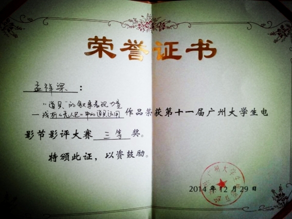 我院2013级广播电视编导专业孟祥梁写作的《无人区》评论文章《道具的叙事表现力量——浅析《无人区》中的道具运用》 获第十一届广州大学生电影节影评大赛三等奖。