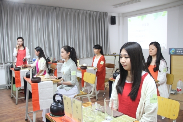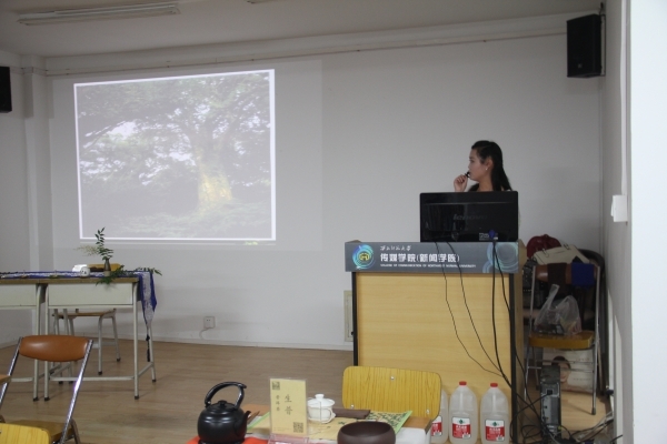 茶艺师与在座传媒学子互动,讲述各地最具代表的茶种及其品性。讲解了茶是什么、茶树的分类、中国茶区的划分、茶叶商品分类四个方面,让学生了解茶。