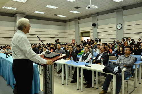 而后讲座开始,陈思和先生从巴金的著作《憩园》谈起,他说在一个偶然的机会读了巴金的小说《憩园》,感动得不能自已、嚎啕大哭,自己就像小说中的“寒儿”一样。随着时间的变迁,陈先生慢慢明白,自己童年与父亲聚少离多,在父爱这方面自己的童年是缺失的,解释了母亲给予孩子的是生活的照顾,而父亲给予的是社会的教育。当陈先生在复旦大学图书馆与同学李辉谈起巴金,被贾植芳先生听到,他们慢慢熟悉后来变成了如父亲般的老师。陈先生童年父爱的缺憾恰恰被复旦大学教授贾植芳先生所弥补,陈思和先生也在贾植芳先生的引导下开始对巴金及现代文学的研究。陈先生在谈及现代文学时讲:“现代文学是一道河,我们如果与它没有关系,那它就是一条河;而当河在我们身上流过,我们成为河床上的一块石头,那现代文学就成了我们生命中不可分割的一部分。”他说:“鲁迅、胡风、巴金、贾植芳等近现代文学的大儒,好像变成了邻居、朋友,不再陌生,读他们的书有不一样的情怀。之后,陈先生回忆了他早期研究巴金作品时的艰苦经历,教导学生做学问就要有吃苦精神。