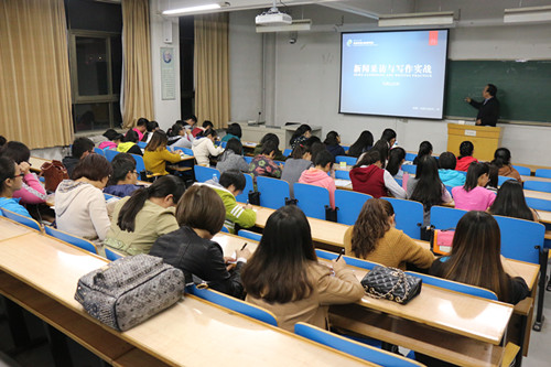 马燕山老师首先就“如何发现新闻”进行讲解。新闻就是指新、奇、特的事情,一个优秀的新闻工作者要有新闻敏感性,要敏锐的感受到新闻,而新闻敏感性可以通过多读书、多看报来培养提高。接着,马老师讲了新闻消息及通讯的组成结构和写作技巧。他说,消息的组成,即新闻标题、消息头、新闻导语、新闻主干、新闻背景。