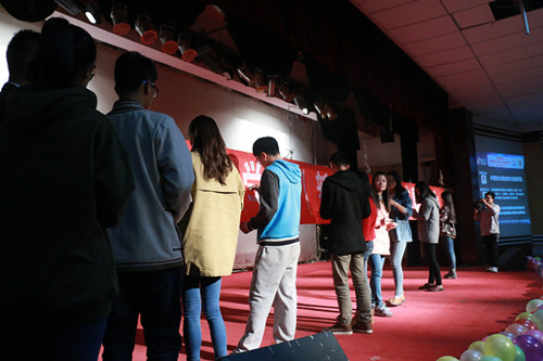 会后,校青协相关部门负责人、金沙990活动大厅学生会干部及各学院青协主席上台在条幅上签名合影留念。