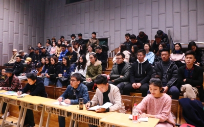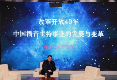 讲座伊始,姚喜双老师对在场的同学们提出问题,“如何用一句话概括改革开放四十年播音主持的发展历史。”