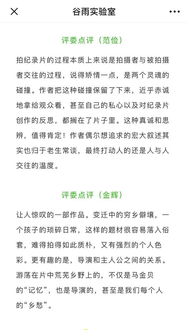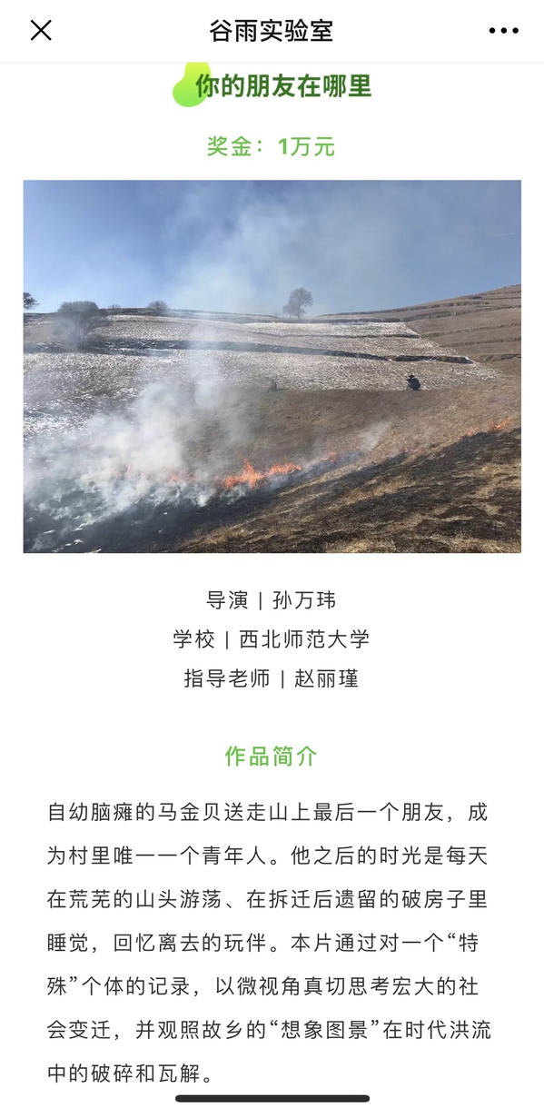 “谷雨计划”由腾讯公益慈善基金会和腾讯新闻联合发起,致力于成为最具专业水准的华语非虚构奖项,是目前国内发掘并助力优秀创作者的最有影响力的平台之一。孙万玮、孙悦与来自北京电影学院、中国人民大学的其他4位青年创作者一起获得“谷雨奖”——“年度校园奖·纪录片”的荣誉和奖金。此次谷雨奖的评委均为国内知名纪录片制作人,《你的朋友在哪里》在评选中得到知名纪录片导演范俭(奥斯卡纪录单元评委,作品曾入选柏林电影节、阿姆斯特丹纪录片电影节、釜山电影节、香港电影节等,代表作《摇摇晃晃的人间》《吾土》等)、知名监制金辉(腾讯“新闻好雨知时”工作室总监,《十三邀》《我的时代与我》监制)的一致好评与推荐,并对影片的后续制作提出期待。