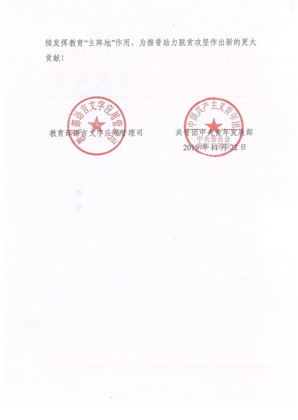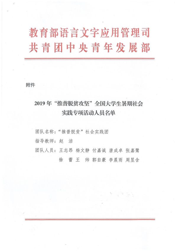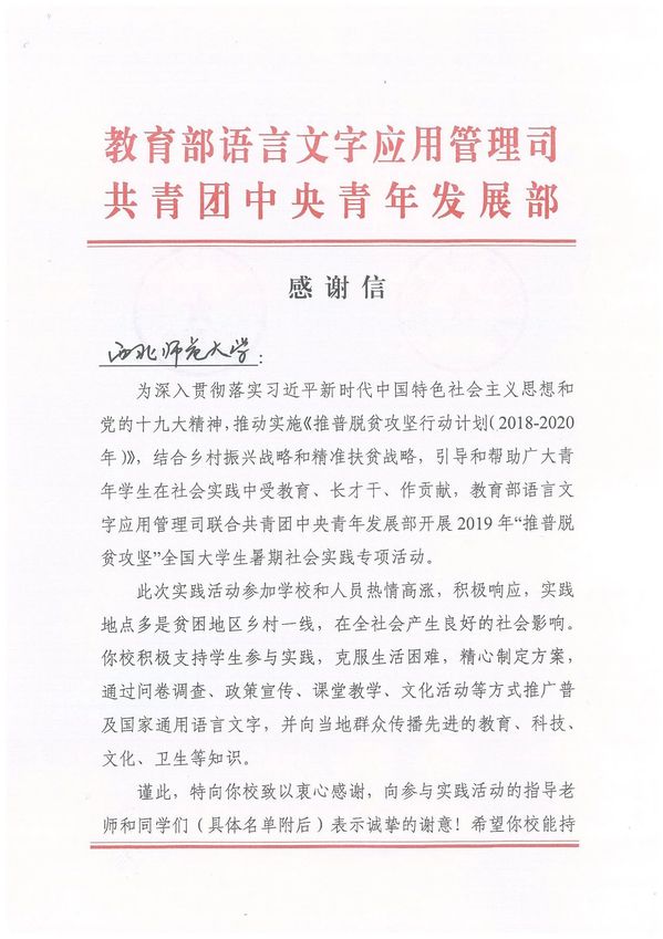 近日,教育部语言文字应用管理司和共青团中央青年发展部致信感谢金沙990活动大厅“推普脱贫”社会实践团为助力推普脱贫作出的贡献。