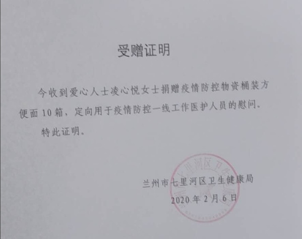 凌心悦,2018级播音与主持艺术1班。她无偿捐赠给兰州市七里河区防疫站十箱方便面。目前,这十箱方便面已经派送到了七里河区四个疫情监测卡口和两个疑似病人隔离机构。