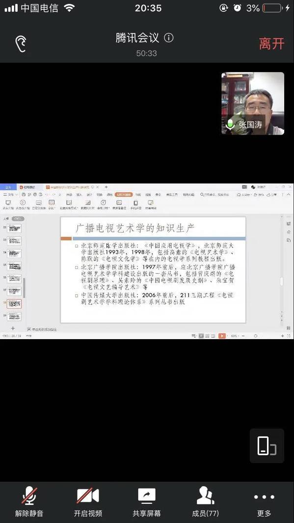 张国涛教授指出,中国影视学科知识生产呈现出明显的“拿来主义”特征,缺乏本土化、自主性。中国影视学科知识生产缺乏体系性、结构性,对中国故事的传播效力较低,中国影视学科知识生产对推动中国影视文化走出去的支撑性不够,中国影视学科知识生产对影视实践的观照还需加强。最后张国涛教授对影视学科和知识体系进行展望,并与石培龙教授对于学科组织、理论深度等问题进行交流。