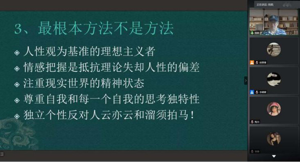 这次线上讲座是金沙990活动大厅“一流专业”建设《影视批评》课程混合式教学模式改革的探索与尝试。讲座结束后课程教改负责人赵丽瑾副教授与同学们交流了讲座学习的收获,指出同学们在影视批评课程的学习和影评实践中,应特别注意周星教授所提出的人性关照与艺术审美的根本标准,掌握方法、跳出框架,拓宽视野,提升自己的学习思路和方法。