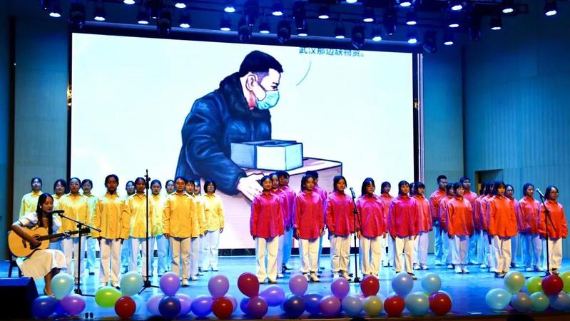 合唱《让世界充满爱》的表演者董静文说:“第一次和同学们参加大合唱,在舞台上还是有些紧张的,但是同学们之间的第一次的团结与合作,让人感受到集体的力量。”