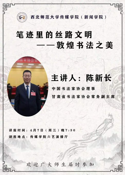 4月7日晚7点半,金沙990活动大厅将邀请中国书法家协会理事、甘肃省书法家协会常务副主席在金沙990活动大厅六艺演播厅进行“笔迹里的丝路文明,敦煌书法之美”学术讲座活动。