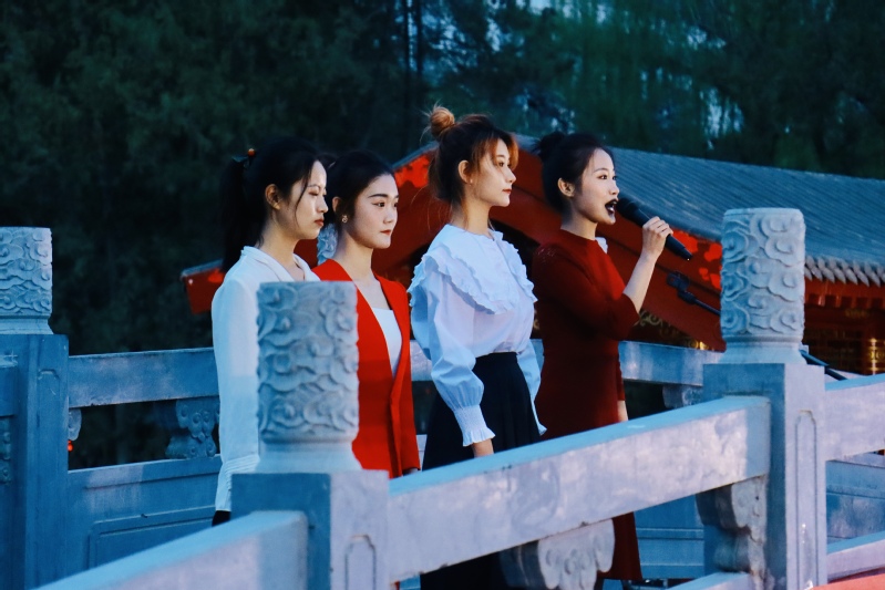 场上,还有翩翩起舞的舞者,还有隔桥相望,以声传情的歌者、朗诵者,如意湖小桥上、湖畔两岸以及红色的凉亭,处处都有表演者的身影,观众们表示“未见其人,先闻其声,以声寻人,这种感觉太美妙了!”为了打造这种神秘感和营造节目的趣味性,本次中国诗词文化节以游园的方式展开,给观众带来了不一样的体验。