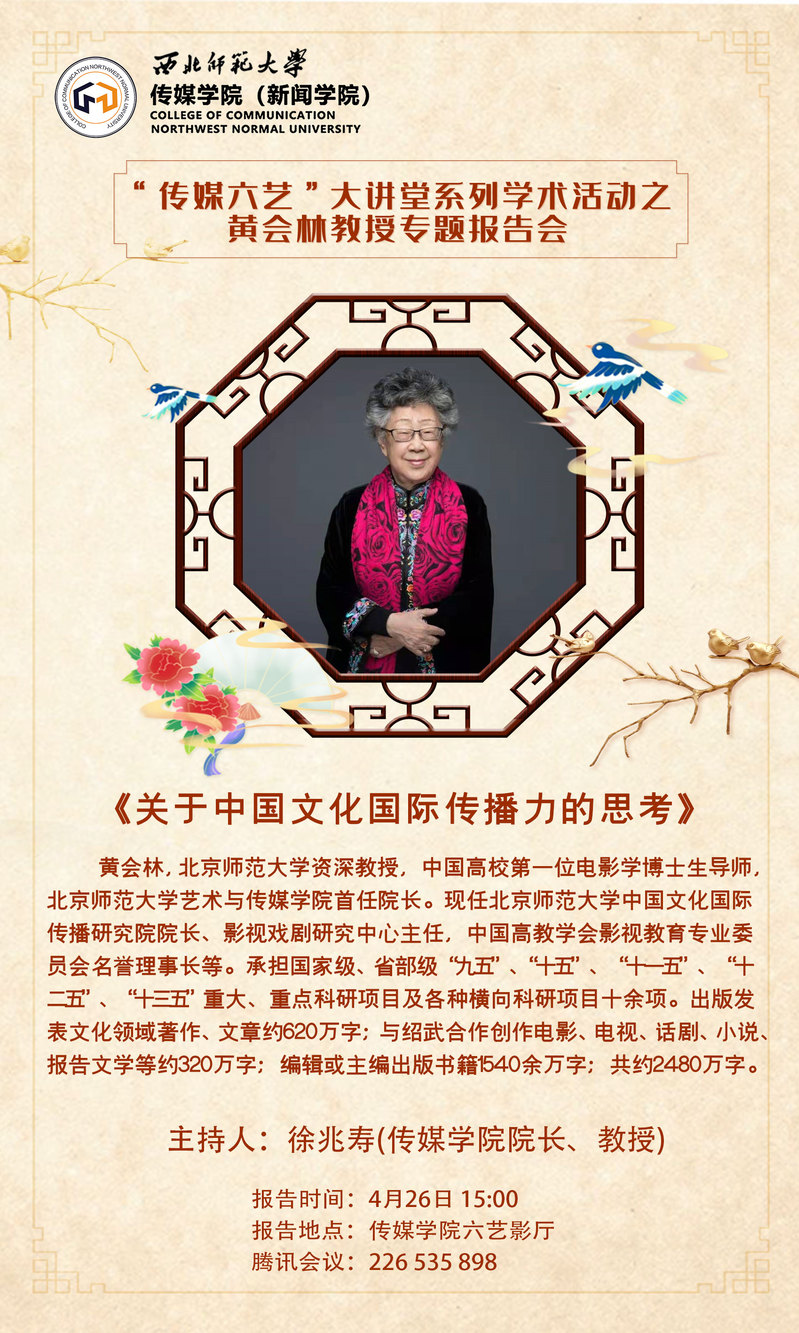 4月26日15:00,金沙990活动大厅将邀请北京师范大学中国文化国际传播研究院院长、影视戏剧研究中心主任,中国高教学会影视教育专业委员会名誉理事长在金沙990活动大厅六艺影视厅举办“传媒六艺”大讲堂系列学术活动之黄会林教授专题报告会。