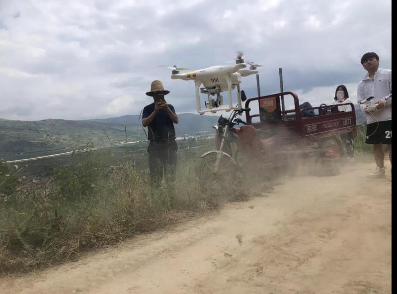 实践队员使用无人机对农户果园及乡村全貌进行航拍。乡村自媒体直播普遍使用手机直播支架等,看到实践队员要用无人机拍下自己果园,张加成拿出手机记录下无人机起飞时刻。