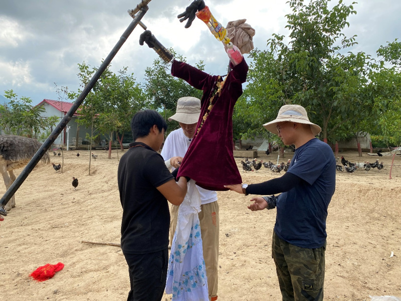图为实践队员与他共同制作稻草人