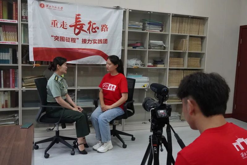 讲解员为我们耐心讲述了中央红军在于都出发长征的历史和故事,在我们的交流中发现,她原来也是当年红军的后代,实践队员郭毓对其进行访谈,了解红军长征的故事。