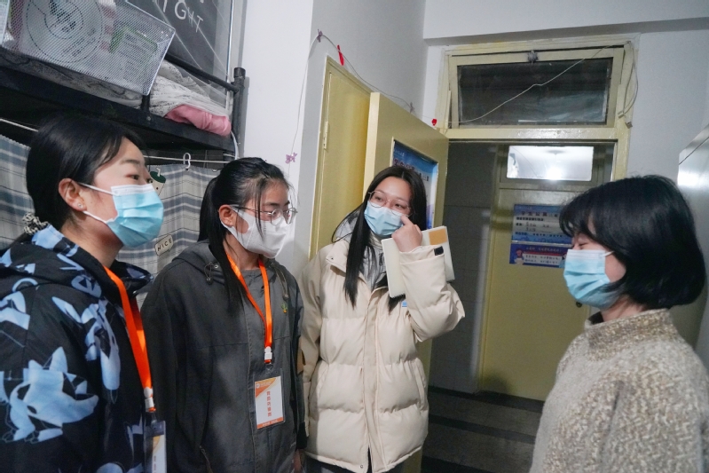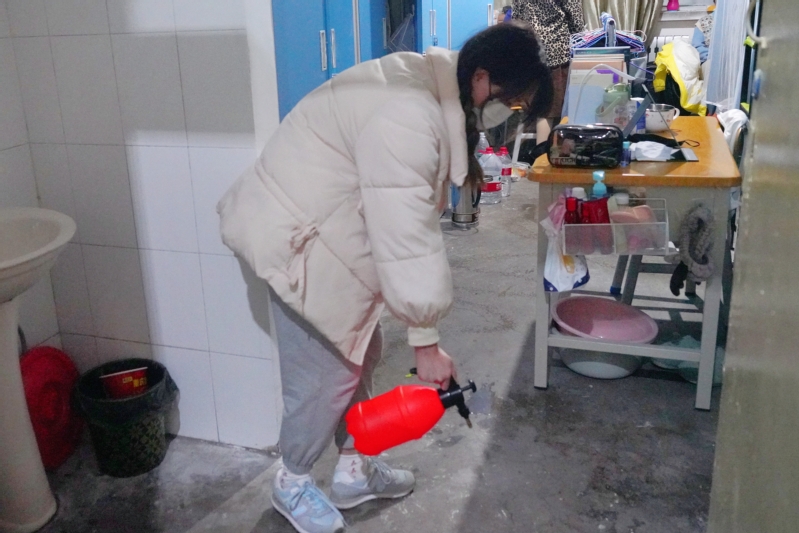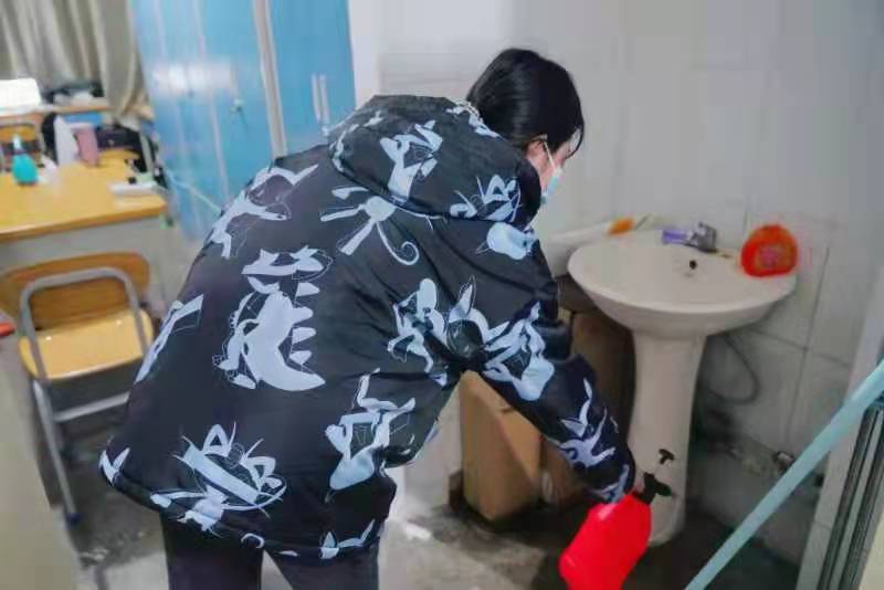 对学院学生所住宿舍进行全方位消毒,可谓是一个艰巨的任务。“你好!金沙990活动大厅消毒。”“请问方便进吗?”“出门记得戴口罩。”在展开消杀工作的同时也对宿舍学生进行生活问候。每一句 “晚上好,金沙990活动大厅消毒”的责任后都有一声“辛苦了,谢谢你们”的感激。消毒人员俯下身子,不放过任何一个角落,红色的消毒瓶走过每一个宿舍,安宁区就多一份“安宁”。