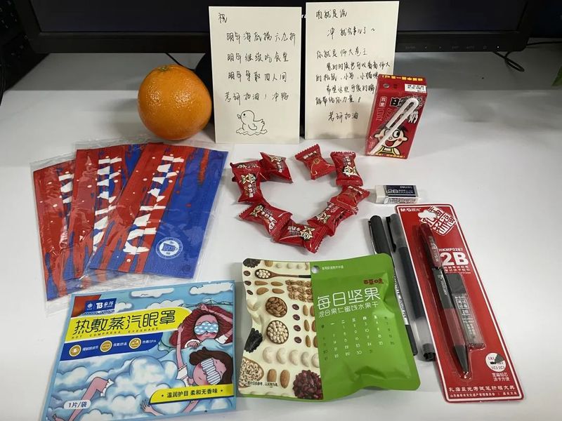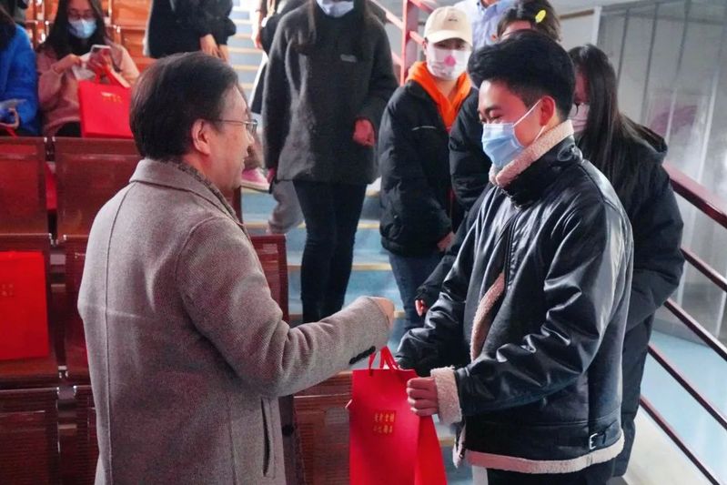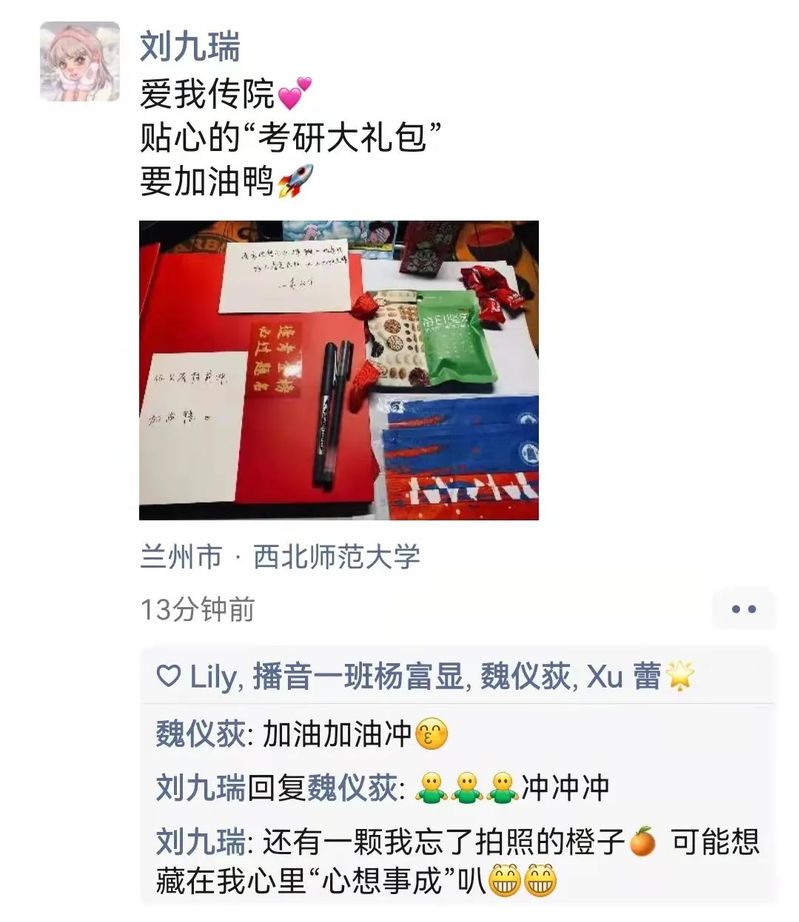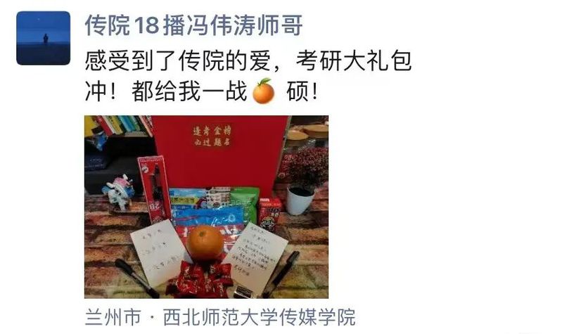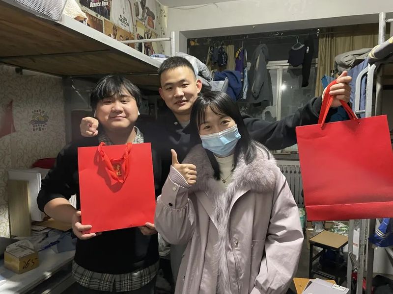 傍晚,学院辅导员周艾、康忠好又来到考研学生宿舍,为他们亲手送上精心准备的考研礼物,并向备考学子加油鼓劲,献上诚挚的祝福。