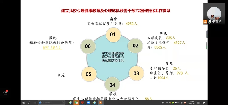 最后她提到学生骨干要明确工作角色,明白危机干预是多方联动的,当发现“问题学生”时,要及时向辅导员或班主任报告。同时学生骨干自身也要注重心理保健。她鼓励参会学生向周围同学提供多方多途径的心理自助资源,来助力每个人的心理问题得以解决。