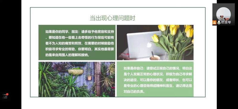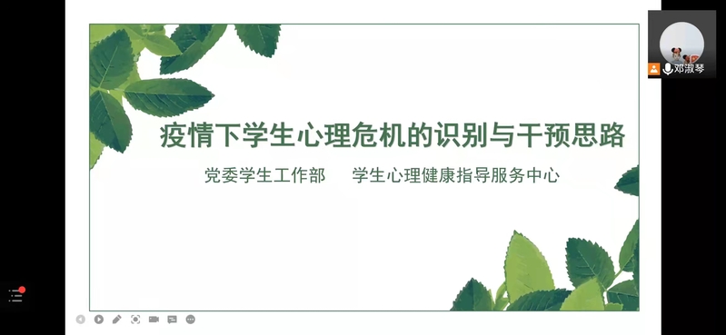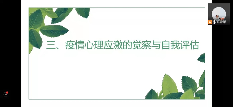 邓淑琴通过学生自杀的社会新闻和相关时政,解释了学生常见心理问题、精神障碍及其原因,引出危机预警所需的特别关注。同时向同学们普及了疫情心理应激的觉察与自我评估,包括心理危机常见的情况和疫情应激下身心反应的具体表现,并通过问卷计分评估的方式判断疫情对自身的影响程度。