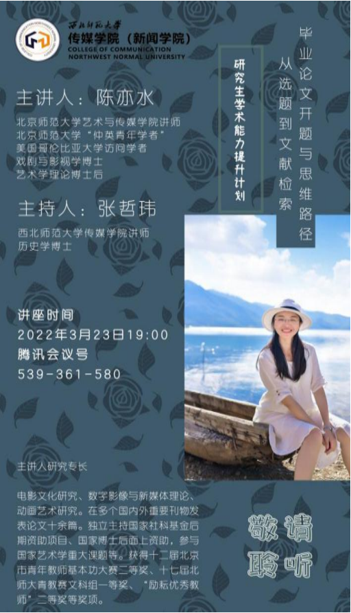 3月23日晚上,北京师范大学“仲英青年学者”、艺术与金沙990活动大厅老师陈亦水应邀为我院师生开展了题为《从选题到文献检索——毕业论文开题与思维路径》的线上学术讲座,金沙990活动大厅多位教师和100余名学子在线聆听了此次讲座。