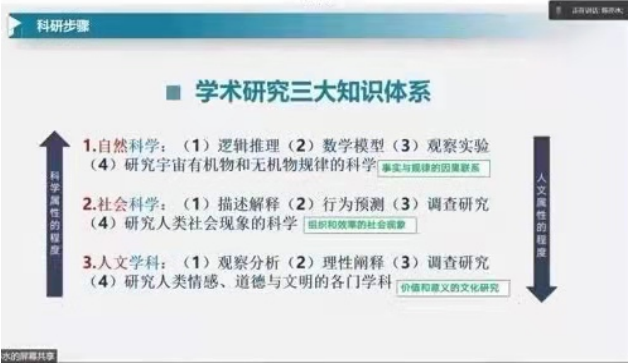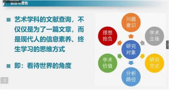 讲座中,陈亦水老师立足于专业实际与研究现状,在梳理科研步骤,建立整体框架的基础上,以确定选题和文献检索为主要切入点,对毕业论文开题与思维路径的探析进行了详细阐述。首先,陈亦水老师梳理了确定选题、文献综述、科研过程、完成论文、同一领域持续关注的科研步骤,强调了确定选题和文献综述的重要性。接着她从学术研究三大知识体系出发,阐述了自然科学、社会科学、人文学科的区别点与交叉性,以此确定艺术学科的研究定位:经验科学传统与人文科学传统,即经验型和阐释型,并分别对这两种研究类型进行了区分说明。其次,陈亦水老师提出了确定选题、保证不偏题不跑题的四个意识:问题意识、目标意识、科学意识、文献意识。其中,她从“培养媒介信息素养能力”、“按照检索思维查找文献”、“学会确定关键词”、“熟练掌握并使用数据库”四方面对文献意识进行了重点论述,她强调文献检索就是在做关于文献的研究工作,本质上就是学习的过程。最后,陈亦水老师为同学们列出了阐释型论文的必备拓展视野、写作规范、架构、行文禁忌等注意事项,并从自身经验出发,提出了多条贴合实际的敬告与警告,例如保持对理论前沿现状的了解、多去图书馆利用馆藏信息、学会建立自己的文献档案、与导师和前辈多交流、切勿抄袭等。她特别提到:艺术学科的文献查询,不仅仅是为了一篇文章,而是现代人的信息素养,终生学习的思维方式,即看待世界的角度。