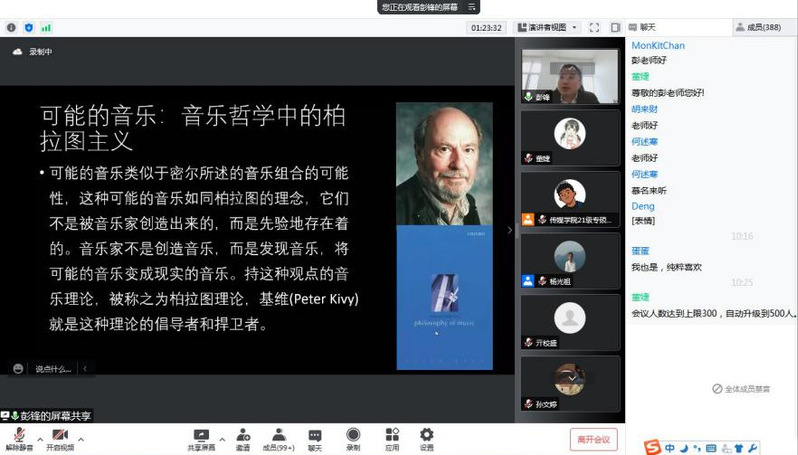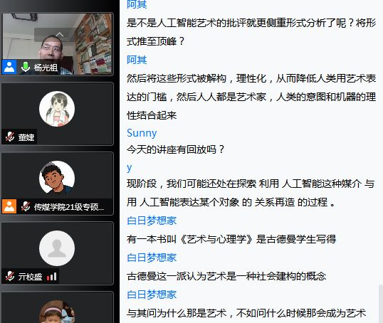 此次讲座由金沙990活动大厅杨光祖教授主持。彭锋教授还在线解答了学生们提出的问题,师生就人工智能与艺术这一话题从多方面进行了讨论与交流。