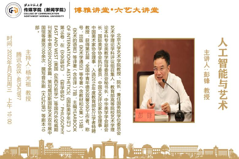 4月6日上午,北京大学艺术学院教授、院长,长江学者特聘教授,国务院学位委员会艺术学理论学科评议组召集人,教育部高等院校艺术学理论教指委秘书长彭锋先生,应邀为我院师生开展了题为《人工智能与艺术》的线上学术讲座,金沙990活动大厅多位教师和300余名学子在线聆听了此次讲座。