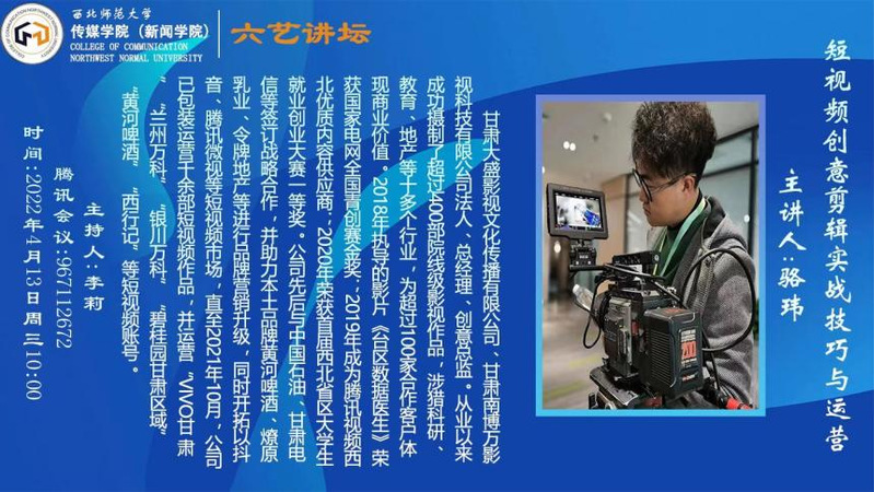 2022年4月13日上午,甘肃大盛影视文化传播有限公司、甘肃南博万影视科技有限公司总经理、创意总监骆玮应邀为我院师生作题为《短视频创意剪辑实战技巧与运营》的线上求职经验分享,传媒学院百余名师生参加了线上讲座。