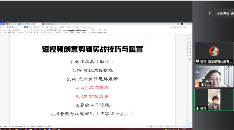 骆玮从业以来成功摄制了超过400部院线级影视作品,涉猎科研、教育、地产、家政、汽车、建筑、IT、通讯、快消品、高新科技等十多个行业。他主要通过成片为同学们介绍pr剪辑思路、创意和剪辑技巧。还介绍了解锁pr的高阶创作——AE的制作技巧和应用,短视频创作中的应用内容垂直化进行了经验分享。