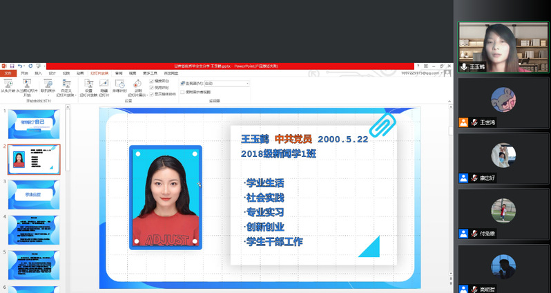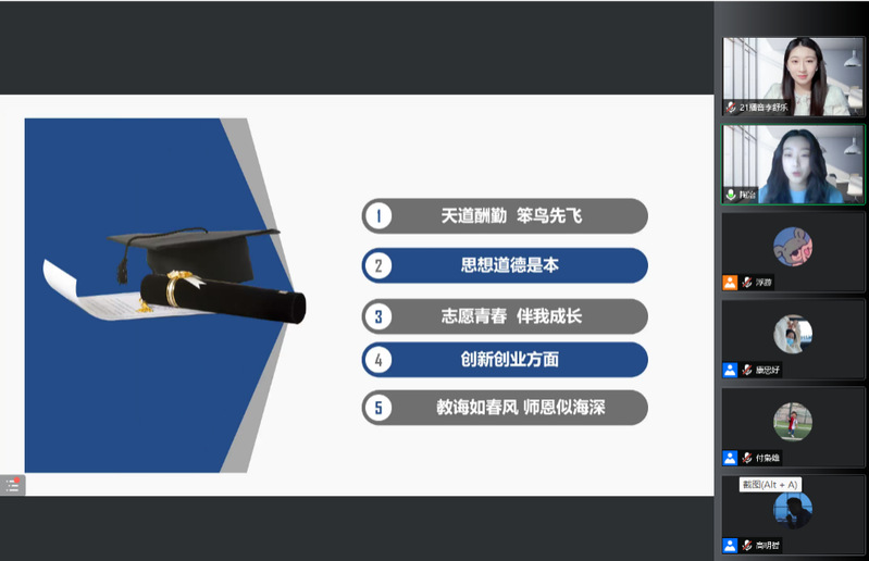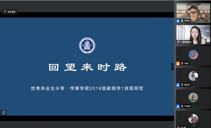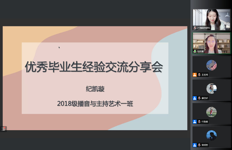 为充分发挥优秀毕业生的榜样示范引领作用,金沙990活动大厅于4月24日晚7点组织开展线上优秀毕业学生经验交流分享会,由学院今年评选出的10位优秀毕业生为大家分享经验。本次会议由2021级播音与主持艺术1班李舒乐主持,金沙990活动大厅党委副书记、副院长甘雯,团委书记付枭雄,所有团委老师及全体学生参加。