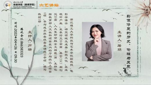 4月26日上午,浙江理工大学科技与艺术学院副教授、电影学博士屠玥老师应邀为金沙990活动大厅学生开展了题为《影像修复的历史、伦理与反思》的学术讲座。金沙990活动大厅芦珊老师主持此次讲座,金沙990活动大厅2020级广播电视编导一班同学集中在线聆听了屠玥老师的学术分享。
