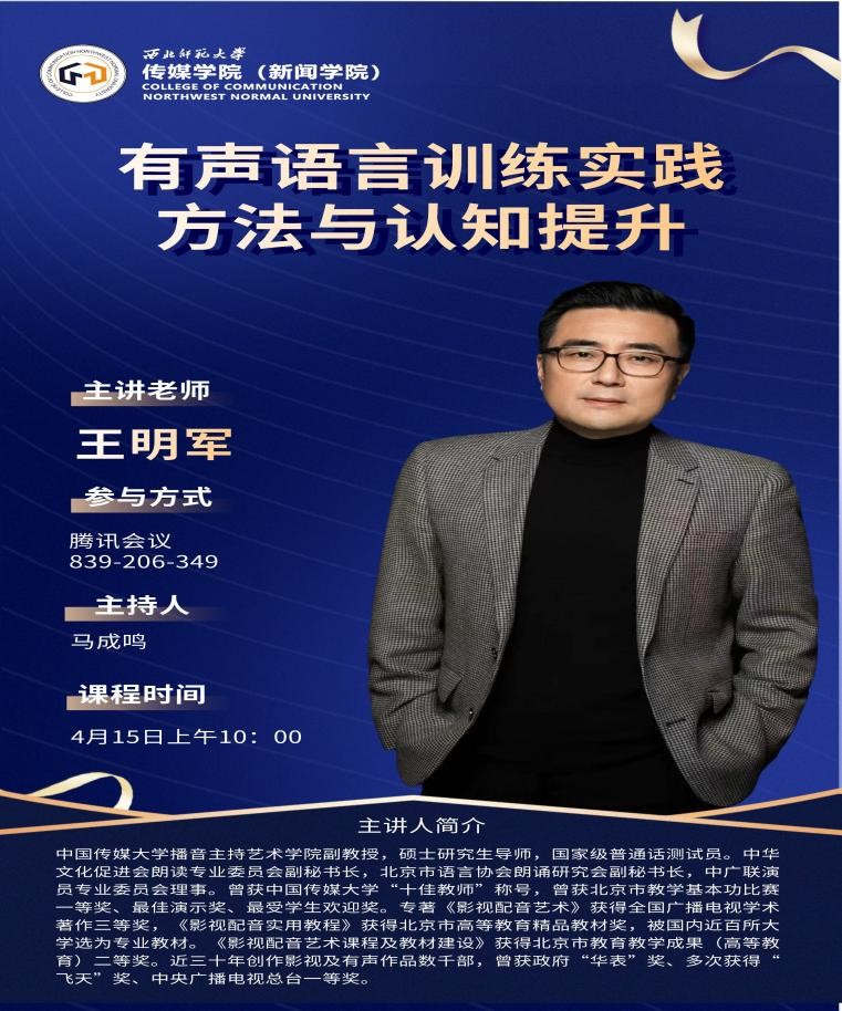 2022年4月15日上午,应金沙990活动大厅邀请,中国传媒大学播音主持艺术学院副教授,国家级普通话测试员王明军为我院师生作了题为《有声语言创作实践方法与认知提升》的线上学术报告。报告会由学院播音系主任马成鸣主持。