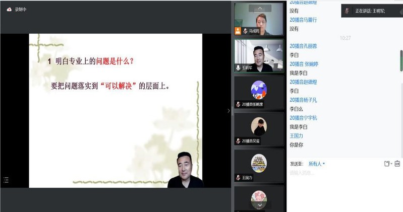 王明军老师从专业学习怎样才能最有收获、如何正确认识播音主持、创作方法的本质规律三个方面阐释了有声语言创作实践的方法与认知提升。报告会的前半部分,王明军老师从如何做到3个“明白”、3个“心”、3个“多”方面分析了专业学习的方法。他从生活实际、受众层面出发,举出日常生活中播音发声常见的正确、错误的案例,通过声乐的发声规律,以小见大、举一反三,消除了同学们对自己专业问题认知上可能存在的误区。王明军老师在讲座中用生活中最简单、质朴的例子,让播音主持专业回归生活,并在研磨播音主持专业的学习中提到了“继承”的重要性。
