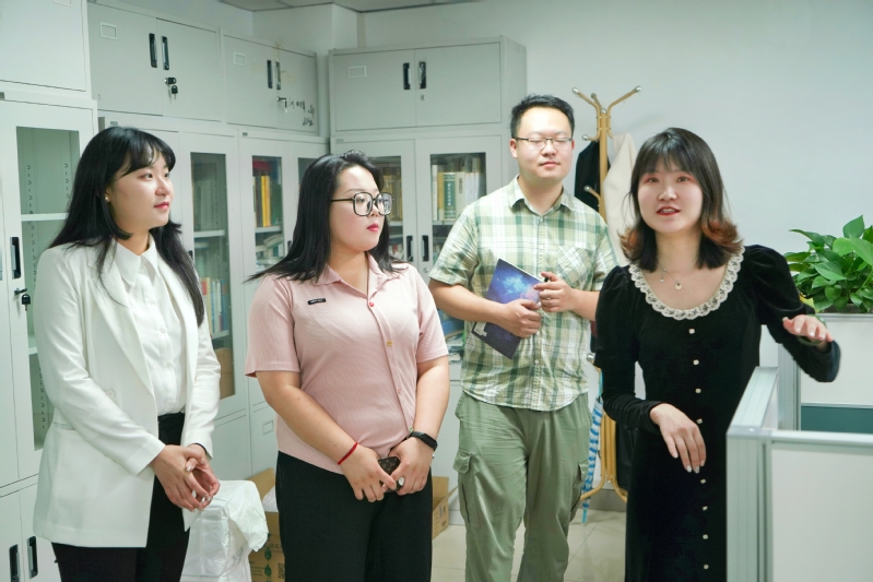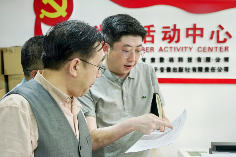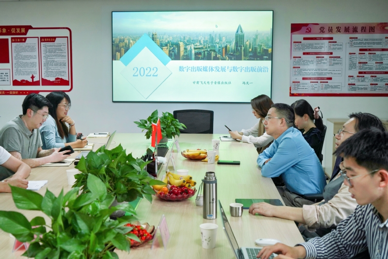 学院师生一行到达甘肃飞天电子影像出版社有限责任公司,参观了解出版办公室、创作间、会议室等工作环境。交流过程中,冯天一就出版社电子信息技术与互联网技术进行展示,讲解其在文化出版领域的作用。