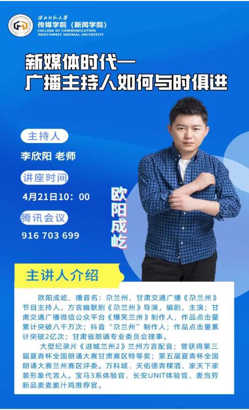 21号上午,甘肃交通广播《尕兰州》节目主持人,方言幽默剧《尕兰州》导演、编剧、主演,甘肃交通广播微信公众平台《爆笑兰州》制作人,甘肃省朗诵专业委员会理事,第五届夏青杯全国朗诵大赛兰州赛区评委,抖音“尕兰州”制作人欧阳成屹(播音名:尕兰州)为我院播音主持专业学生开展了题为《新媒体时代广播电视主持人如何与时俱进》的学术讲座,金沙990活动大厅播音主持专业教师李欣阳主持此次讲座,学院2020级学生在线聆听了欧阳成屹老师的学术分享并开展了互动交流。